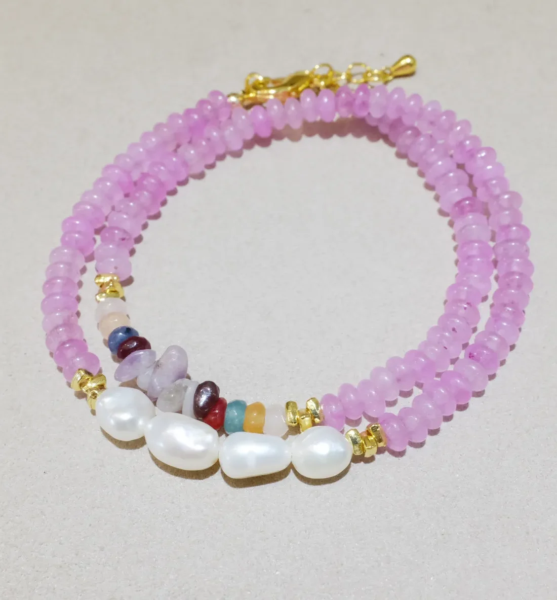 Handmade by Petite Gleam, the Dreamy Purple Mist bracelet blends amethyst, freshwater pearls, multicolor gemstones, and moonstone. This mauve-pink-purple bracelet offers a dreamy, elegant look perfect for everyday wear or gifting yourself a nature-inspired piece of jewelry.