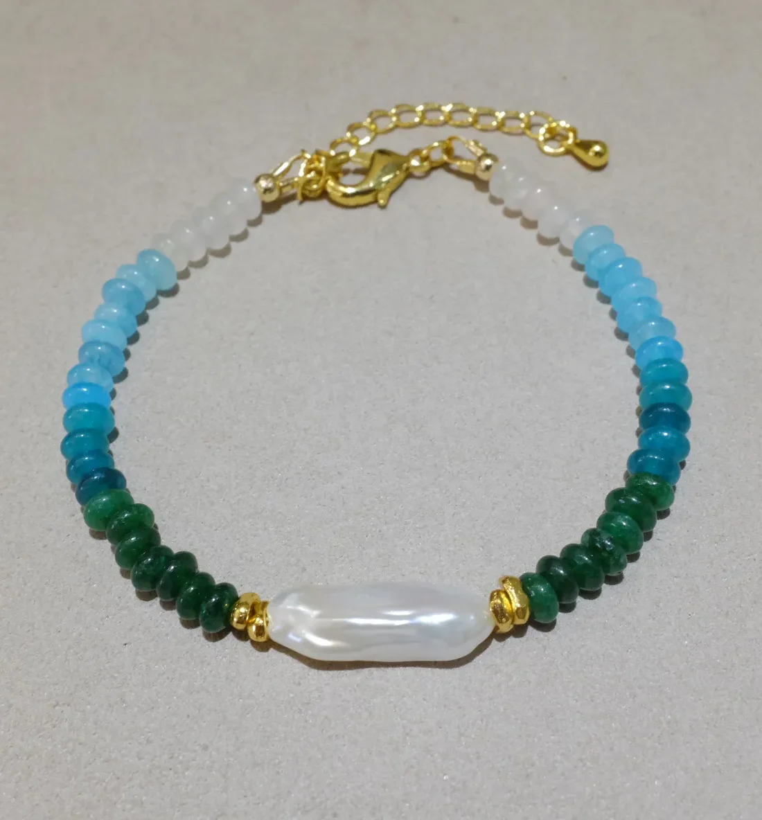 Handmade by Petite Gleam, the Deep Sea Shine bracelet features blue-gradient multicolor gemstones and freshwater pearls. With emerald blue and dark green hues, this unique bracelet evokes ocean depth and mystery, perfect for bold daily style or gifting someone special.