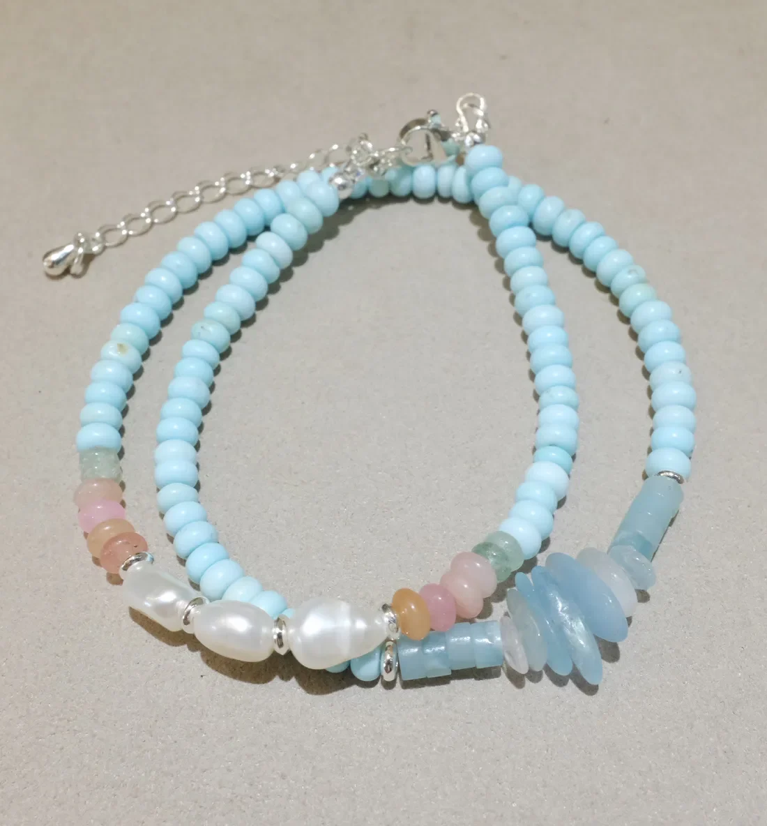 Petite Gleam’s Blue of Freedom bracelet combines blue turquoise, multicolor gemstones, moonstone, and freshwater pearls in a handmade design. Light blue hues create a fresh, natural accessory perfect for casual wear or a meaningful gift.