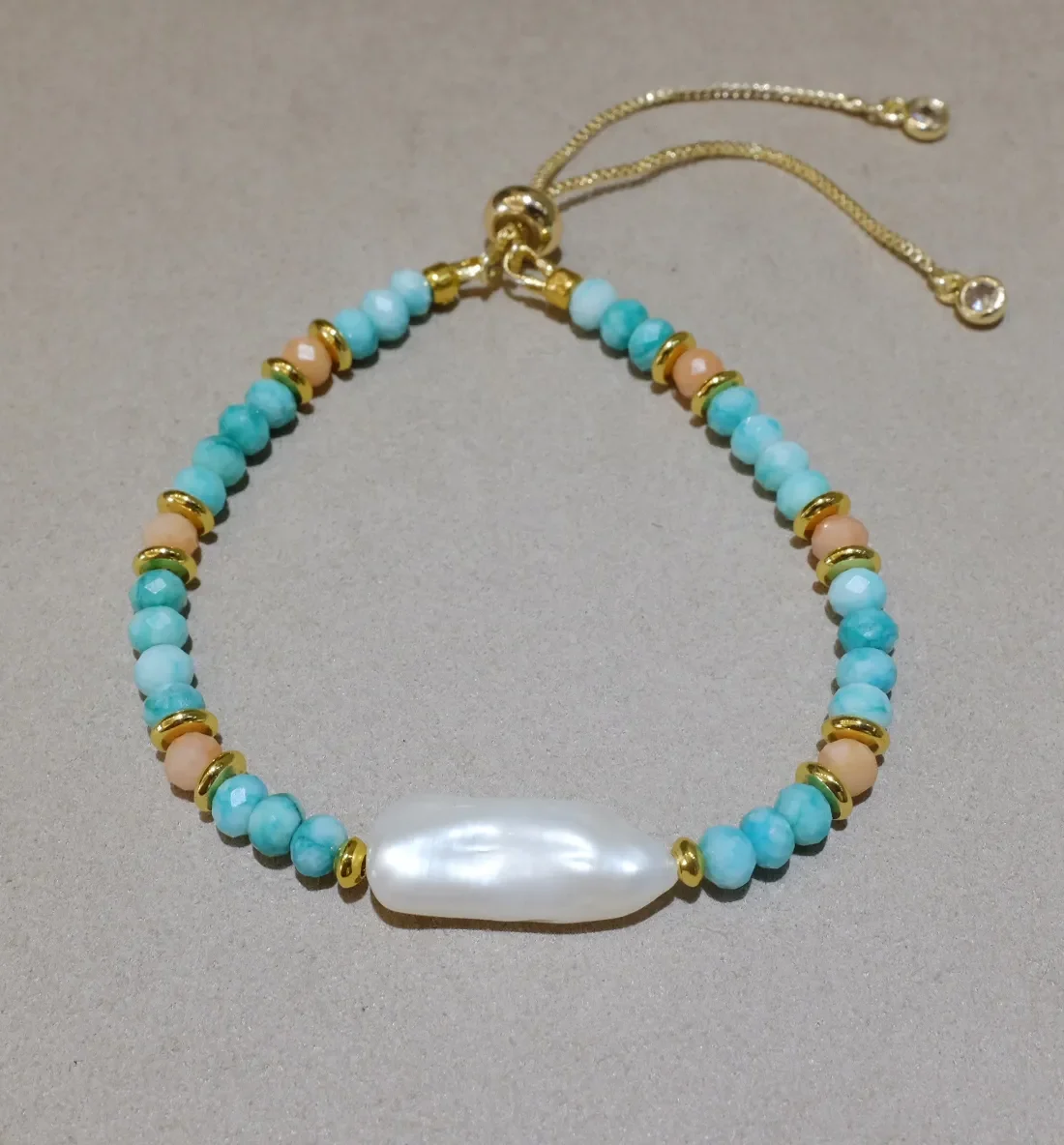 Handmade by Petite Gleam, the Flowing Emerald Spring bracelet combines jade, pink aventurine, and freshwater pearls. A soothing blend of blue and green tones makes it a refreshing, nature-themed accessory—perfect for personal style or heartfelt gifting.