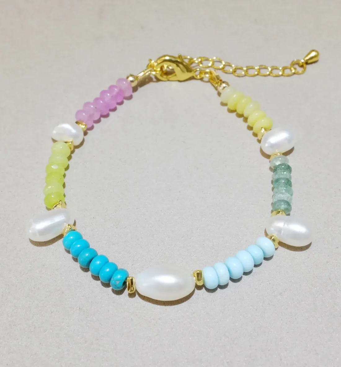 Petite Gleam’s Moonlit Scales bracelet blends amethyst, yellow-green turquoise, olivine jade, and more, with freshwater pearls. This vivid multicolor bracelet is handmade and unique—perfect for lovers of artisanal gemstone jewelry and nature’s palette.