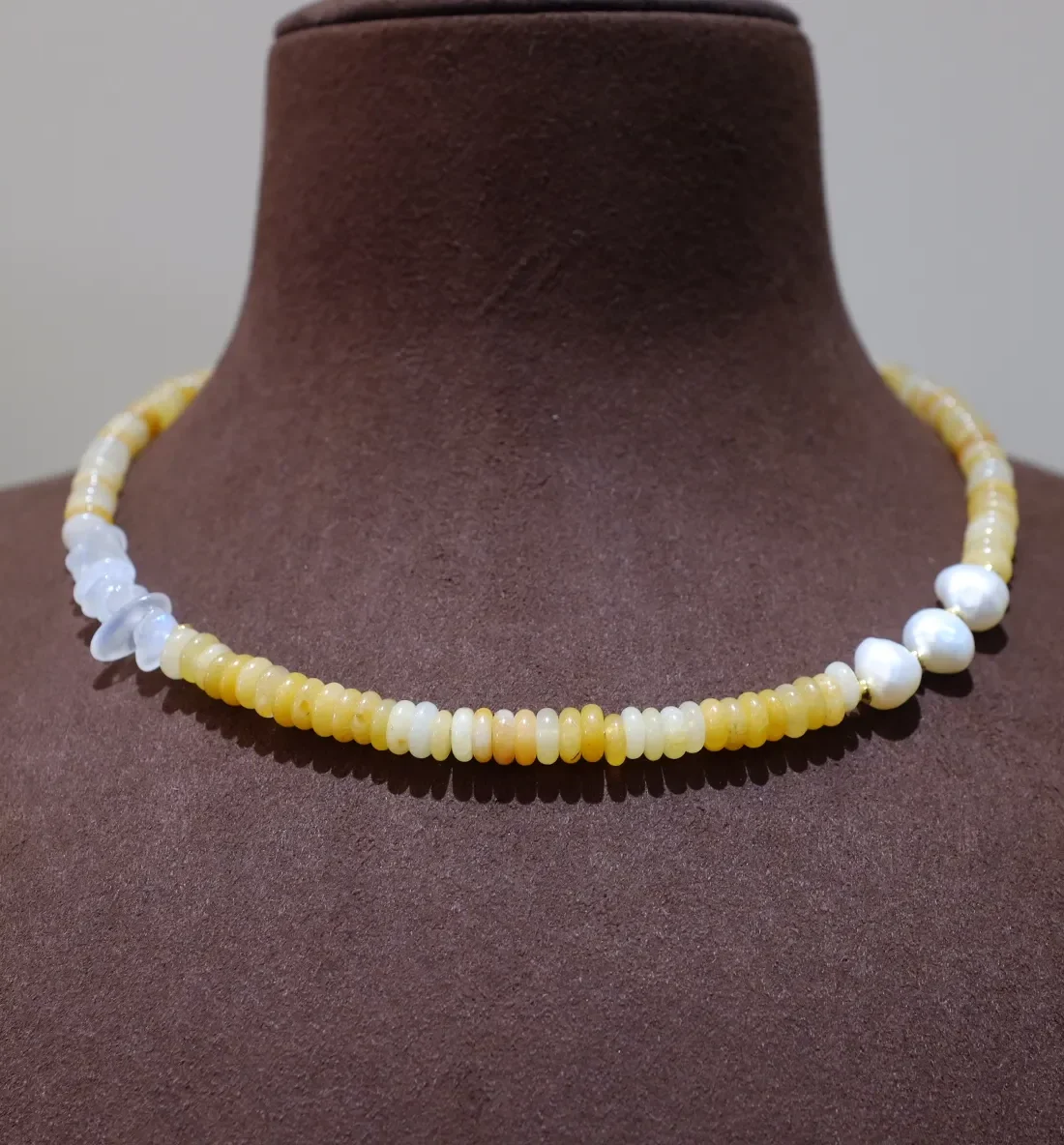 The Amber Frosting necklace by Petite Gleam features light yellow jade, moonstone, and freshwater pearls. With soft corn-yellow tones, this handmade gemstone necklace offers subtle warmth and natural charm—perfect for gifting or styling with ease.